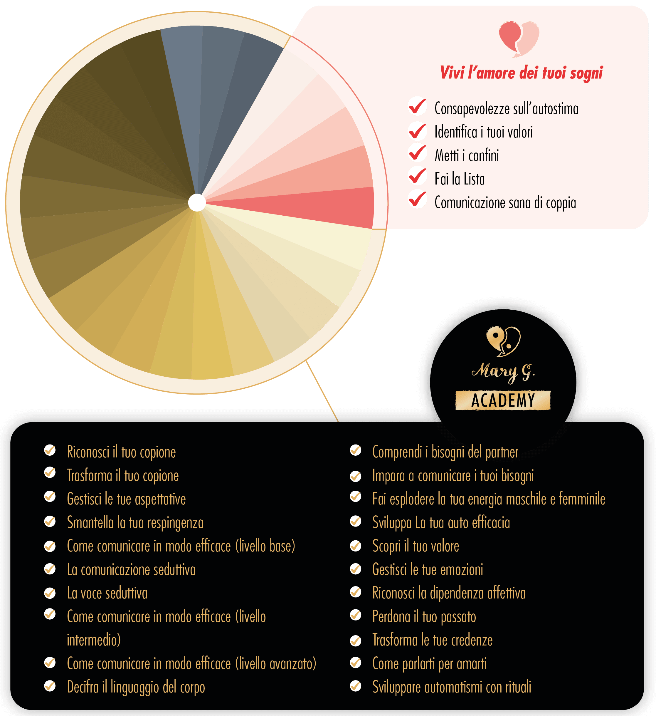 Far parte del team di Mary mi rende fiera perché quello che si impara è basilare per la gestione non solo della propria vita affettiva ma anche del rapporto che abbiamo con noi stesse. Ho imparato ad ascoltare, a fare domande anziché suggerire soluzioni, a delegare, ad affidarmi, a ricevere feedback, a risolvere situazioni delicate, a gestire il fastidio e tanto tanto altro.